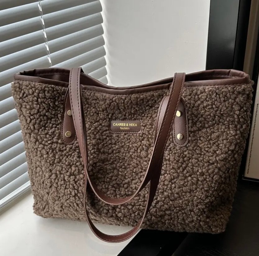 Kahverengi deri kadın çanta, kürk detaylı, rahat ve bohem tarzda, günlük kullanıma uygun. Yumuşak dokulu, desensiz gri vurgular içerir.