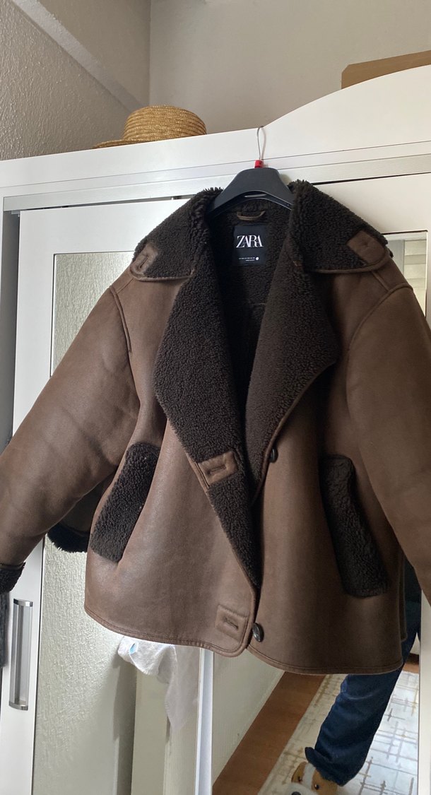 Kahverengi deri kadın ceket, kürk detaylı ve kesik yaka özelliklerine sahiptir. Bol kesim, uzun kollu ve midi boydadır, sokak modası için uygundur.