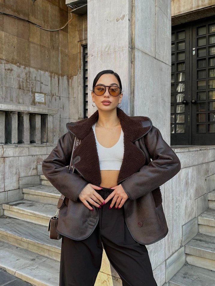 Kahverengi deri, kürklü detaylı, kısa ve uzun kollu, regular fit kadın ceket. Günlük sokak stiline uygun.