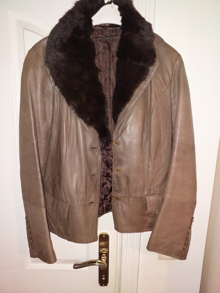 Kahverengi deri, kürk detaylı yakalı, uzun kollu, midi boy, desen içermeyen, ofise uygun gotik tarzda kadın ceketi.Hakiki deri