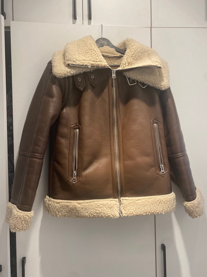 Kahverengi deri ceket, yaka, manşet ve eteğinde kürk detaylıdır. Notch yaka, fermuarlı ve normal kesimdir, rahat sokak stili için uygundur. Bol kesim M bedenede uygundur