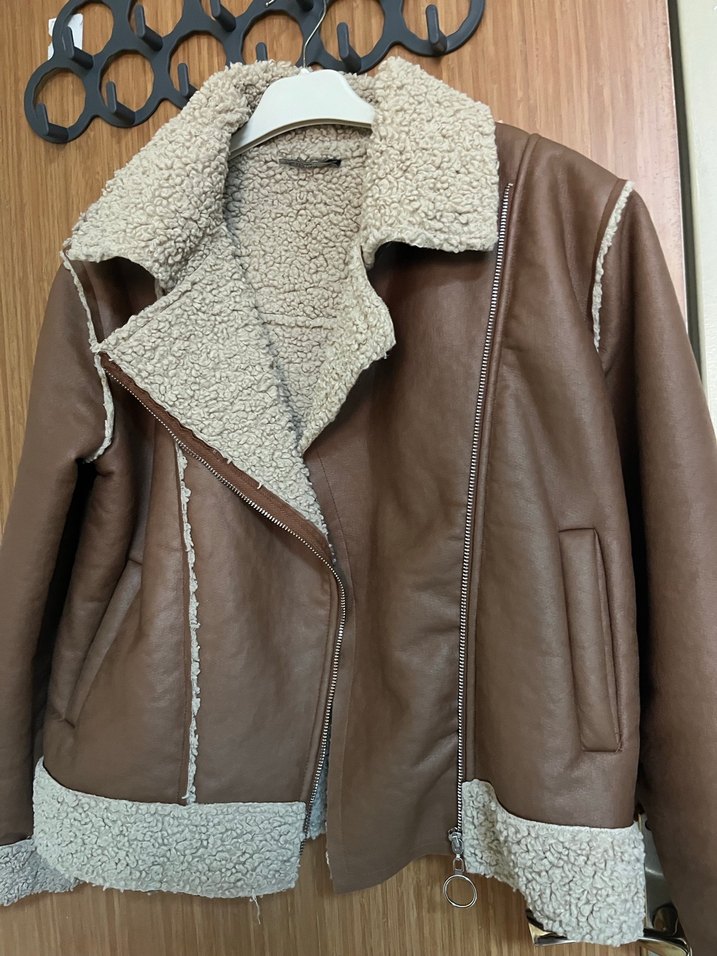 Kahverengi deri ceket, kürklü detaylarla, kesik yaka ve uzun kollu. Rahat kesimi ve midi boyuyla günlük sokak stiline uygun.