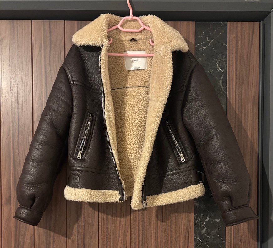 Kahverengi deri, kürklü astarlı, oturan kesim kadın ceket. Klasik yaka, askılı kol ve midi boy ile rahat sokak stili için uygun.sayılı kullanıldı temiz