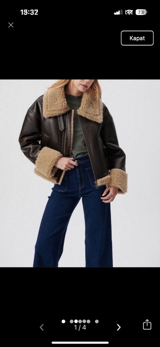Kahverengi deri ceket, kürklü yakası ve manşetleri ile dikkat çekiyor. Notched lapel yaka ve uzun kollu, normal boy midi kesimdir.