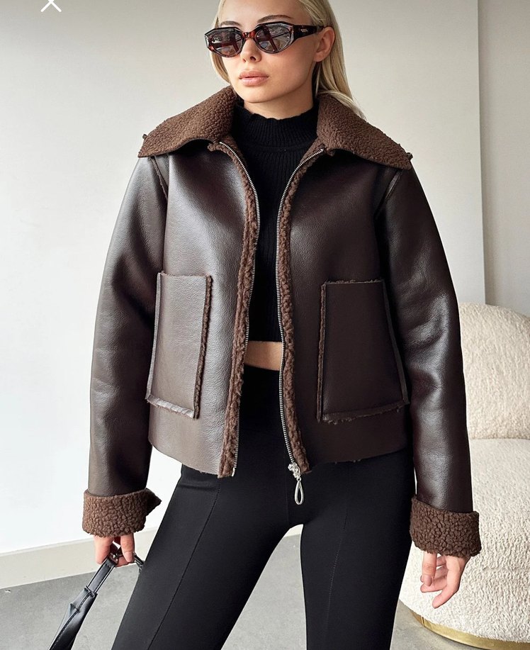 Kahverengi deri ceket, yakada ve manşetlerde kürk detaylıdır. Normal boy midi uzunluğunda, uzun kollu ve regular fit kesimlidir. Günlük kullanıma uygundur.