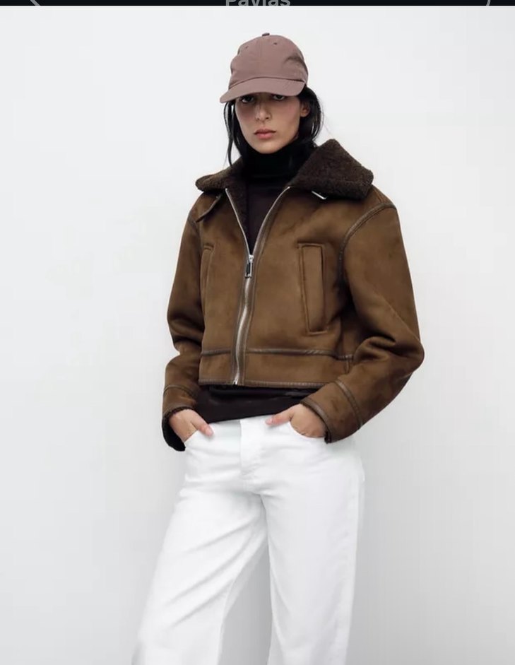Kahverengi deri ceket, kısa kesim ve kürklü yakasıyla sıcaklık sağlar. Fermuarlı ve cep detaylı, gündelik şıklık için uygundur.