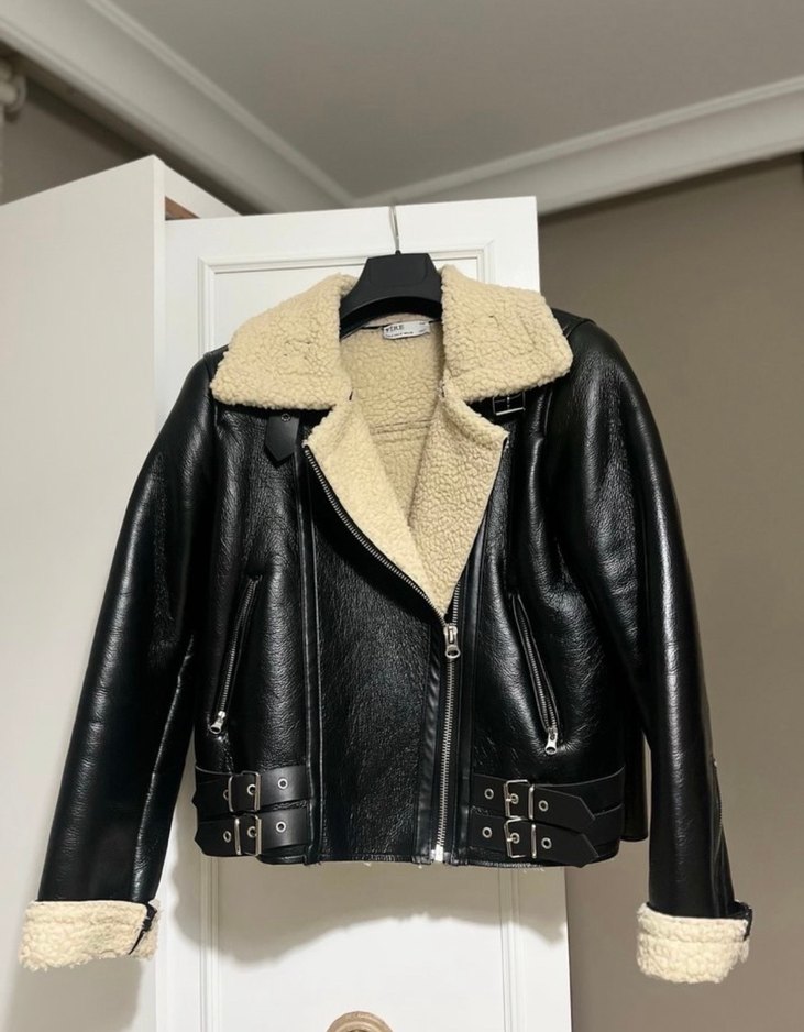 Kahverengi deri, kürk detaylı, normal boy ve sıkı kesim kadın ceket. Notlu yakası ve kayışlı kollarıyla rahat ve şık bir görünüm sunar.