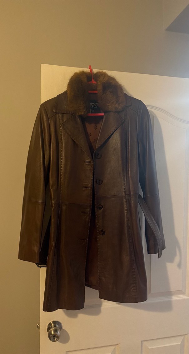 Kahverengi deri ceket, kürklü yakası ve uzun kolludur. Normal boyda, regular fit ve klasik tarzda, ofis için uygundur. Desensiz şık bir modeldir.
