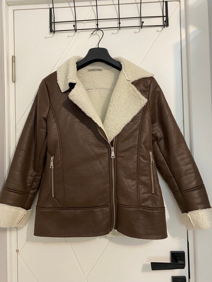 Kahverengi deri, fitted kesim, normal boy, uzun kollu, yakası kürklü, fermuarlı ceplerle detaylandırılmış kadın ceket. Sokak stiline uygun, sıcak tutan tasarım.