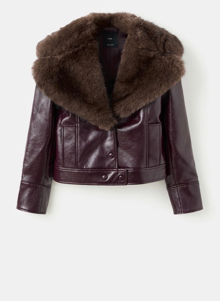 Kahverengi deri kadın ceket, kürklü yakası ve normal kesimiyle dikkat çeker. Parlak yüzeyi ve midi boyu ofis için uygundur. Strappy kollu, desensiz Paris tarzı şık bir modeldir.