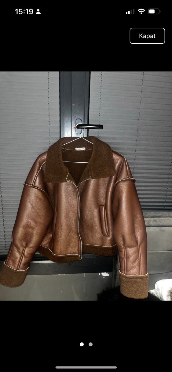 Kahverengi deri, kürklü detaylı, uzun kollu, normal uzunlukta, oturan kesim kadın ceket.