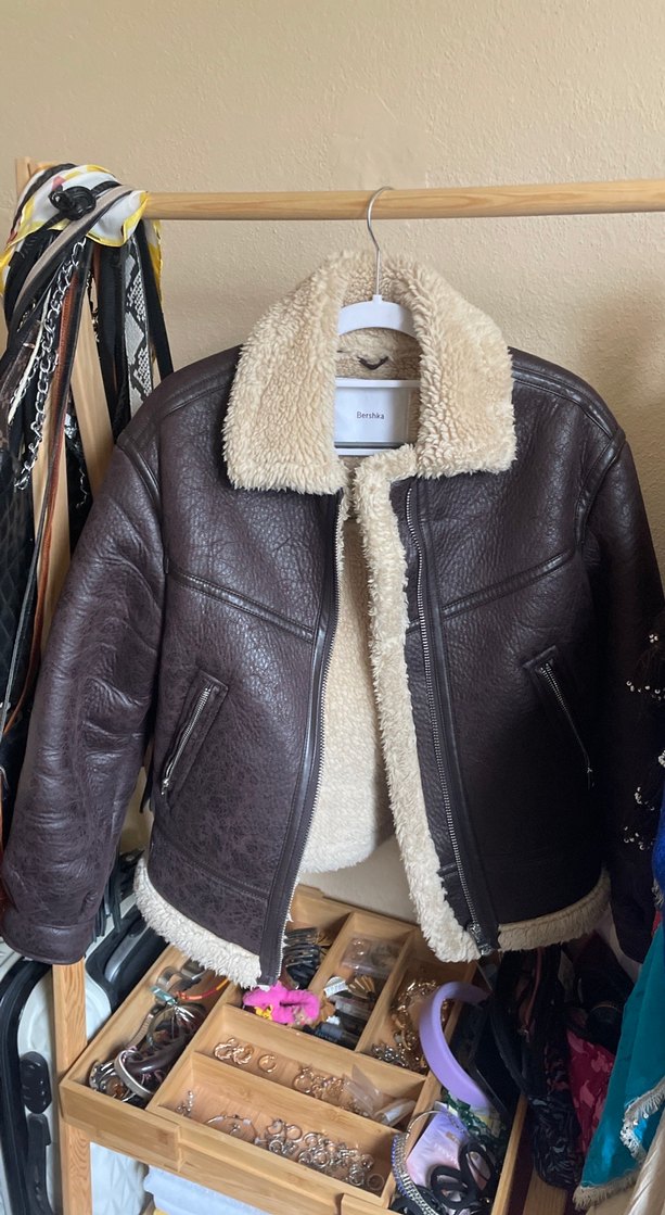 Kahverengi, kürklü yaka ve iç detaylı, normal boy, dar kesim deri ceket. Sokak modasına uygun, yakası kesik model, rahat ve sıcak tutar.