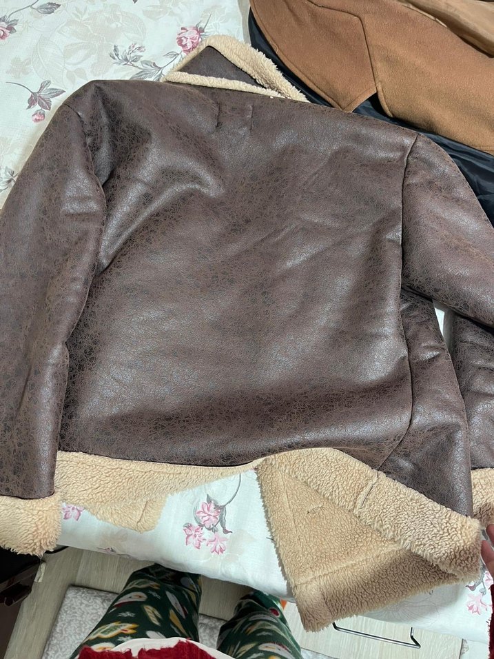 Kahverengi deri ceket, kürk detaylı ve kesik yaka. Uzun kollu, bol kesim ve midi boyda, rahat sokak stili için uygun.