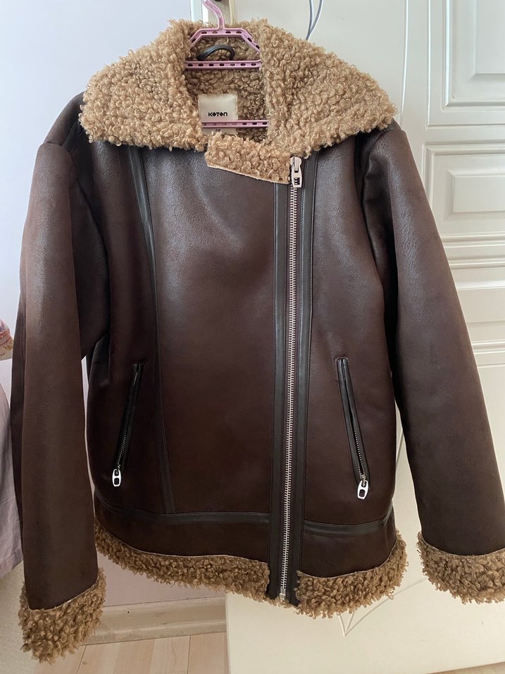 Bu koyu kahverengi ceket, kesimli ve yakasında, manşetlerinde ve kürk detaylarıyla rahat sokak stili için uygundur.