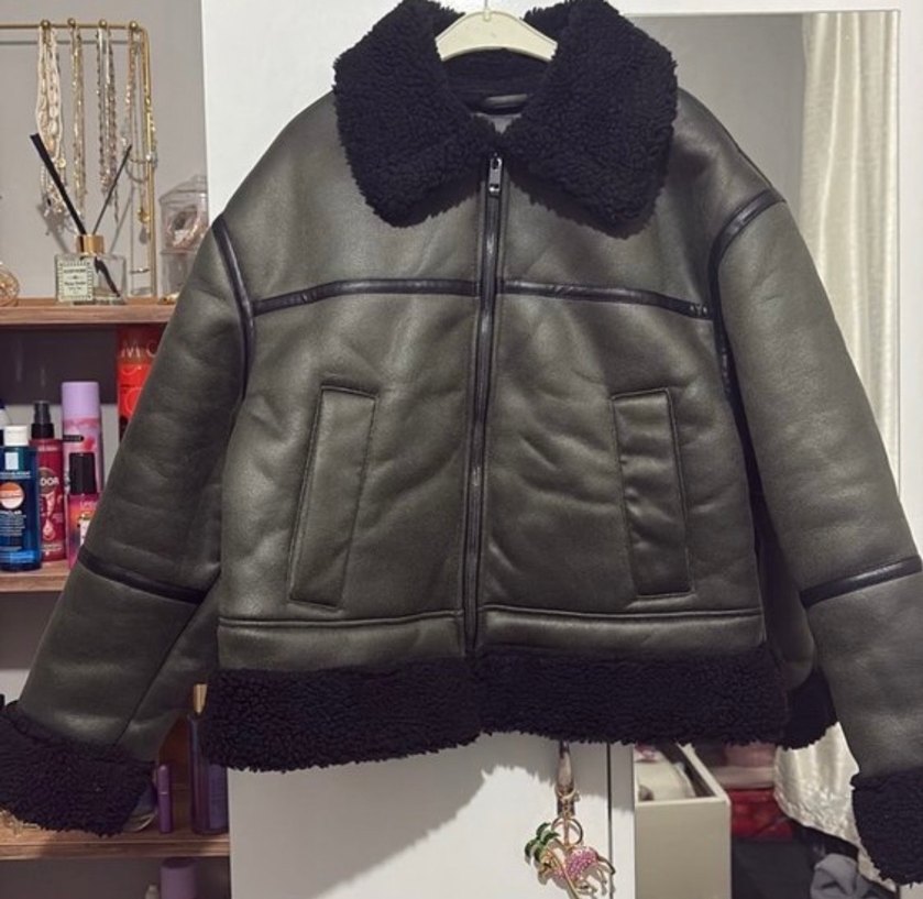 Kahverengi deri, kürklü detaylı, yakalı ve askılı kollu, bol kesim sokak stili kadın ceket.