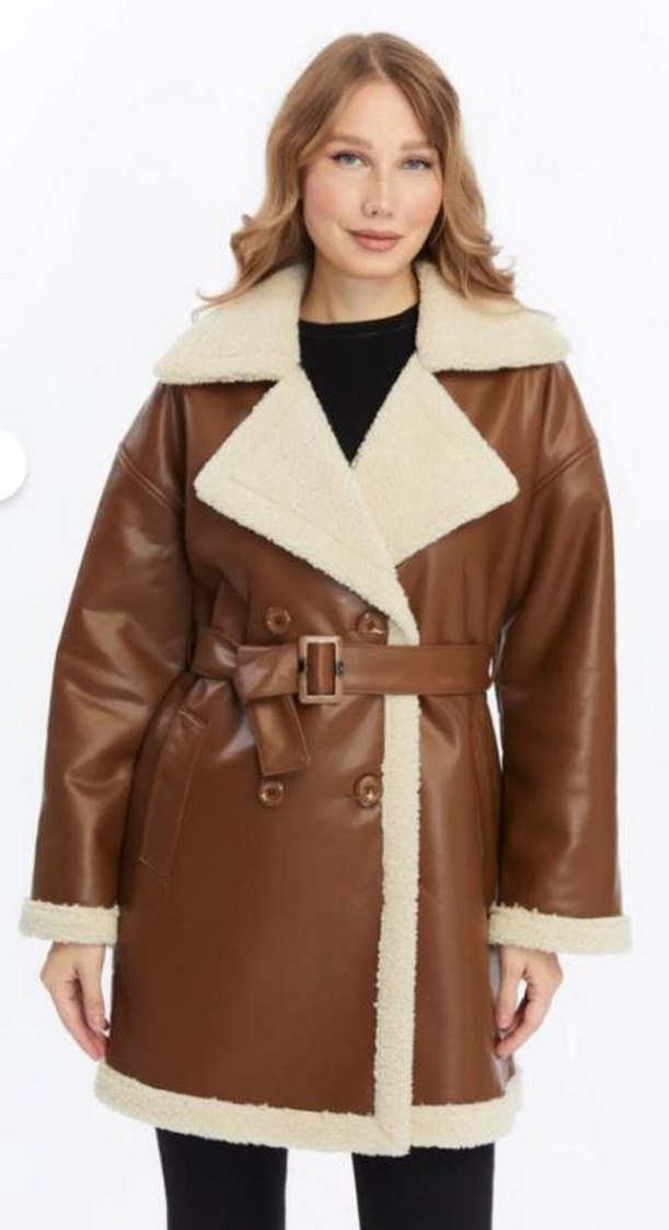 Kahverengi deri kadın ceket, kürk detaylı ve kesimli yakaya sahip. Normal boyda, rahat kesim ve ofis ile sokak stili için uygun. ✨
