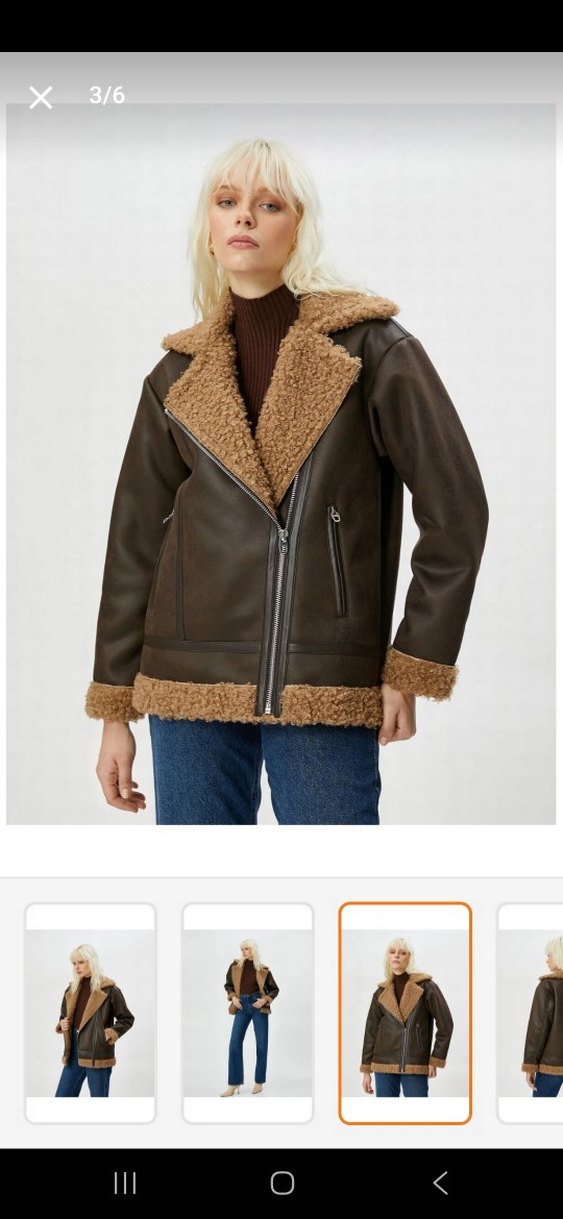 Kahverengi deri ceketin yaka, manşet ve etek kısmında kürk detayları bulunur. Notlu yaka, uzun kollu ve normal kesimdir, günlük kullanıma uygundur.