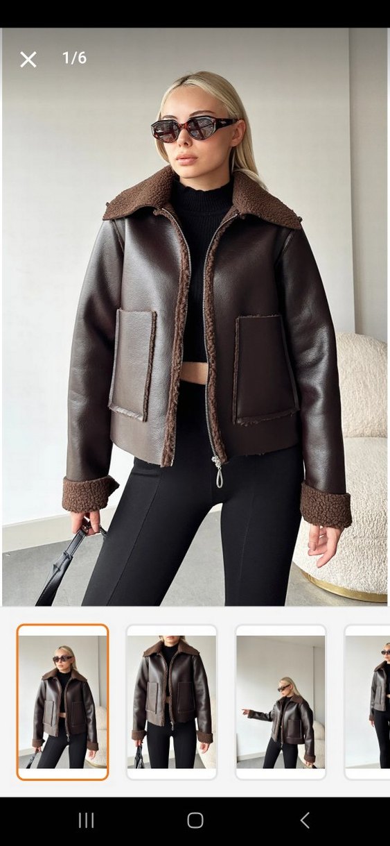 Kahverengi deri ceket, uzun kollu ve yakasında, manşetlerinde ile ceplerinde kürk detayları bulunur. Normal kesim ve midi boyda, rahat sokak stili için uygundur.