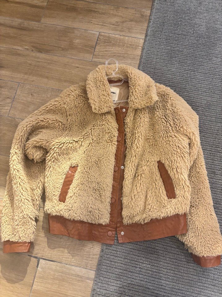 Kahverengi deri ceket, kürklü detaylara sahip, kesik yakalı ve uzun kolludur. Bol kesim ve normal boyda, rahat sokak stiline uygundur.