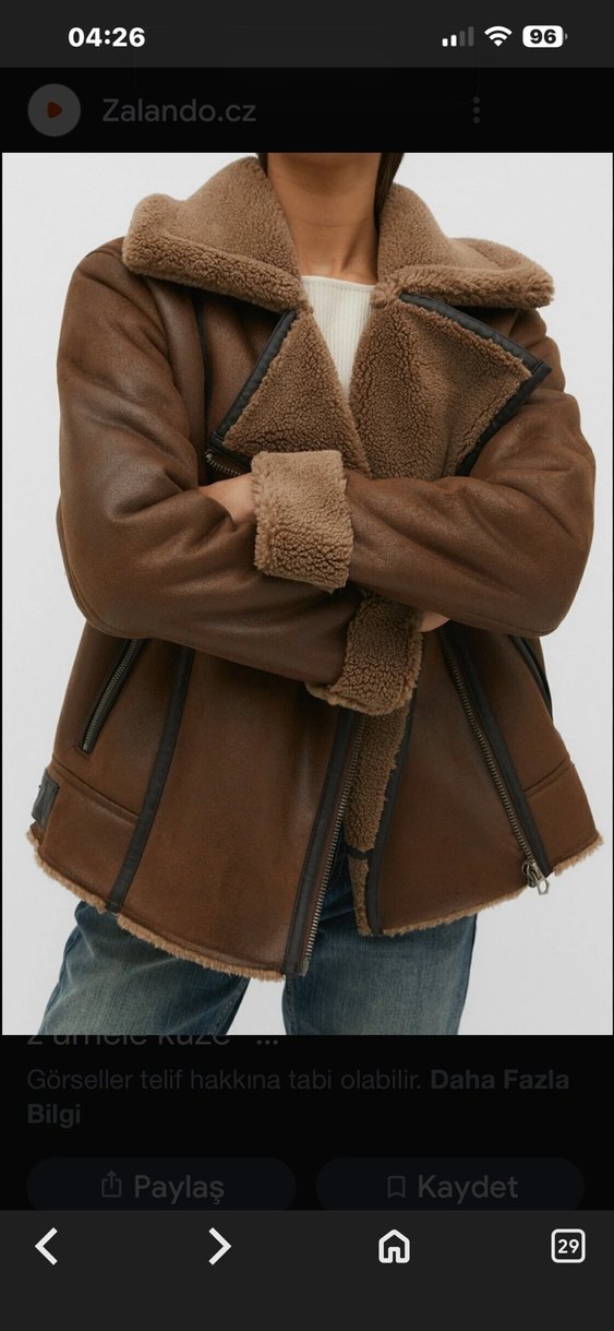 Kahverengi deri ceket, rahat kürk detayları ve kesik yaka ile tasarlanmıştır. Orta boy, normal kesim ve askılı kollara sahiptir. İçi kürklü bir yada 2 sefer giyildi tertemi son fiyat