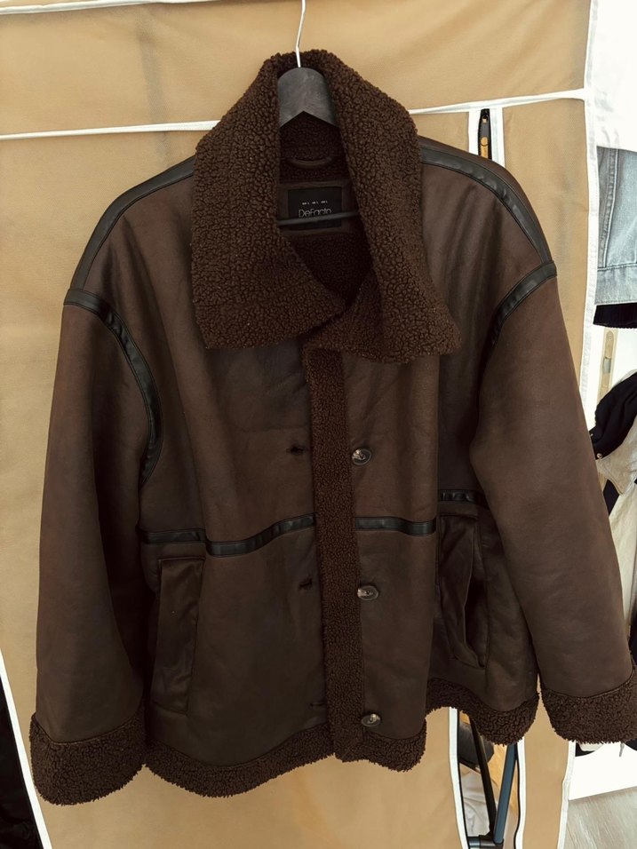 Kahverengi deri ceket, kürk detaylı ve kesik yakalıdır. Bol kesim, uzun kollu ve midi boyda, günlük kullanıma uygun şık bir parça.