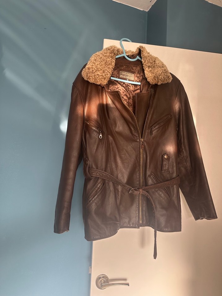 Kahverengi deri ceket, kürklü yaka ve askılı kollara sahip. Yaka tipi klasik, midi boyunda ve vintage tarzda sokak giyimine uygun.