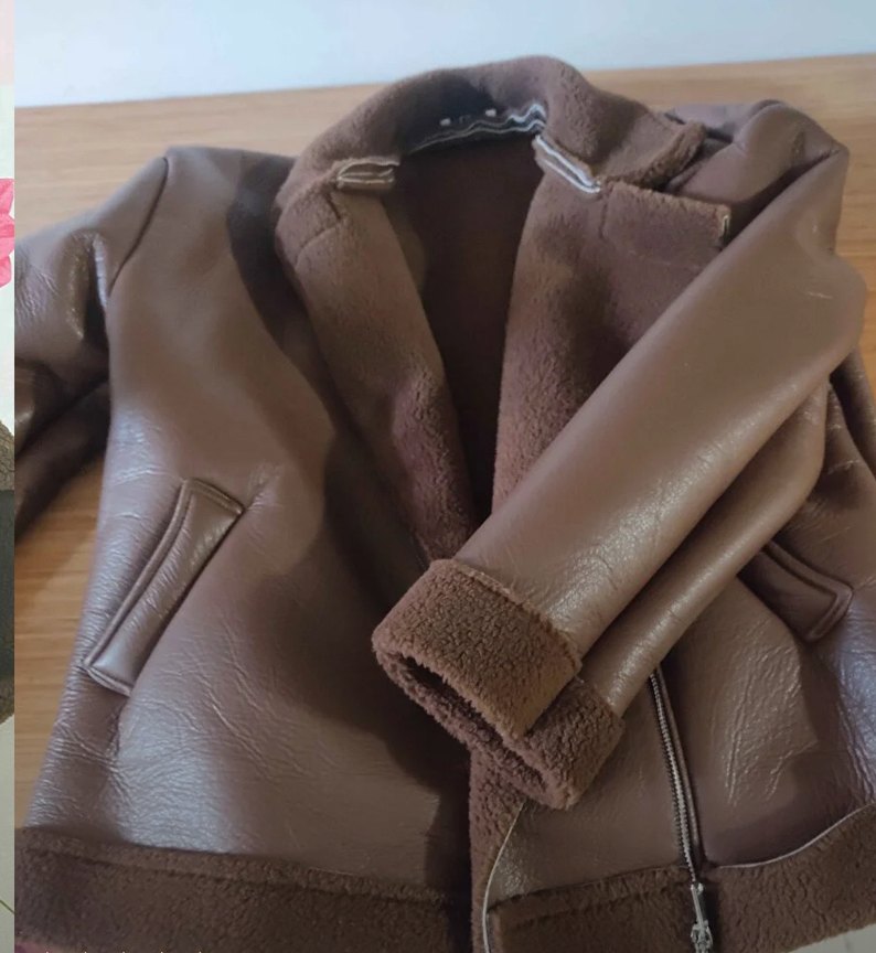 Kahverengi deri, kürklü detaylı, yakalı, uzun kollu, günlük kullanım için rahat ve sokak stili uyumlu kadın ceketi.