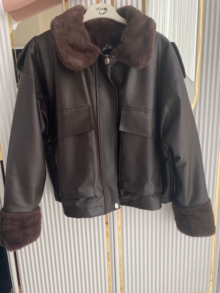 Kahverengi deri kısa ceket, kürk detaylı yakası ve manşetleriyle, kesik yakalı ve regular fit modeldir. Trendy casual sokak stiline uygundur.
