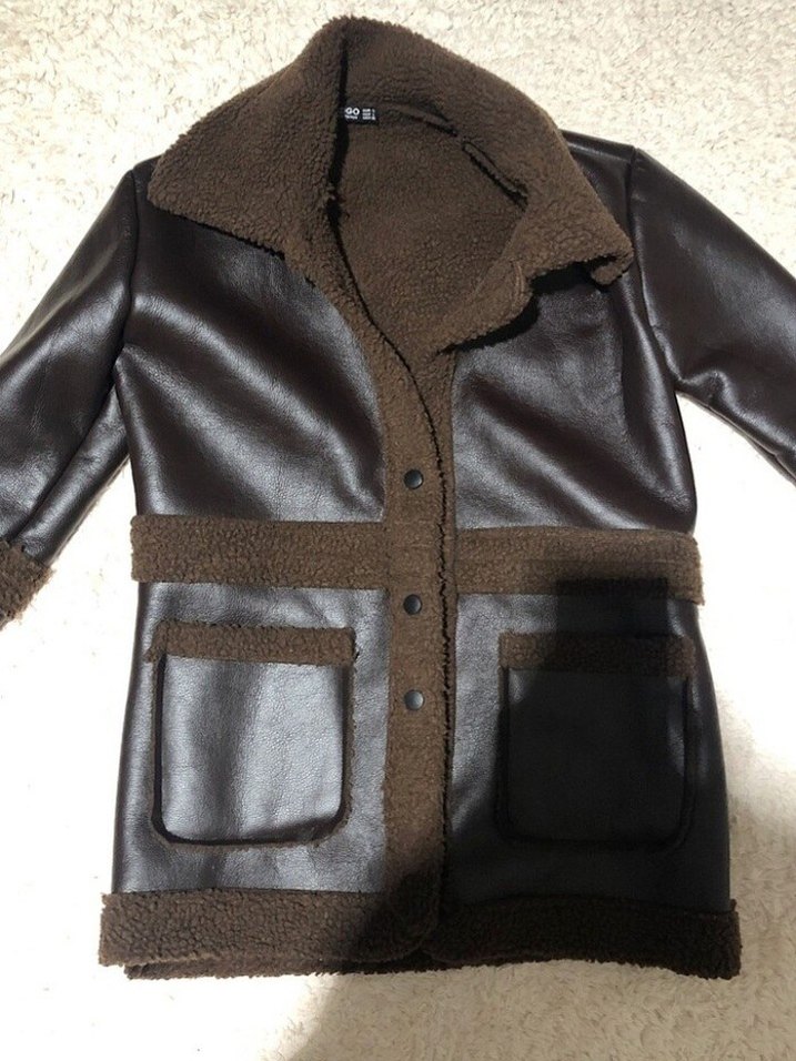 Kahverengi deri ceket, uzun kollu ve yakasında, ceplerinde ve etek ucunda rahat kürk detaylarına sahip. m-l beden