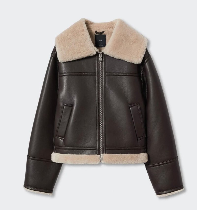 Kahverengi deri kadın kış ceketi, kürk detaylı yaka ve etek ucu, kesik yaka ve normal kesim ile rahat sokak stili için uygundur.
