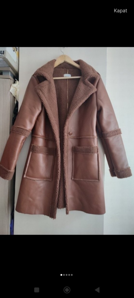 Kahverengi deri kışlık ceket, kürk detaylı ve kesik yaka ile tasarlanmıştır. Uzun kollu, midi boy ve rahat kesimdir. Trend sokak stili için uygundur. marka temsildr