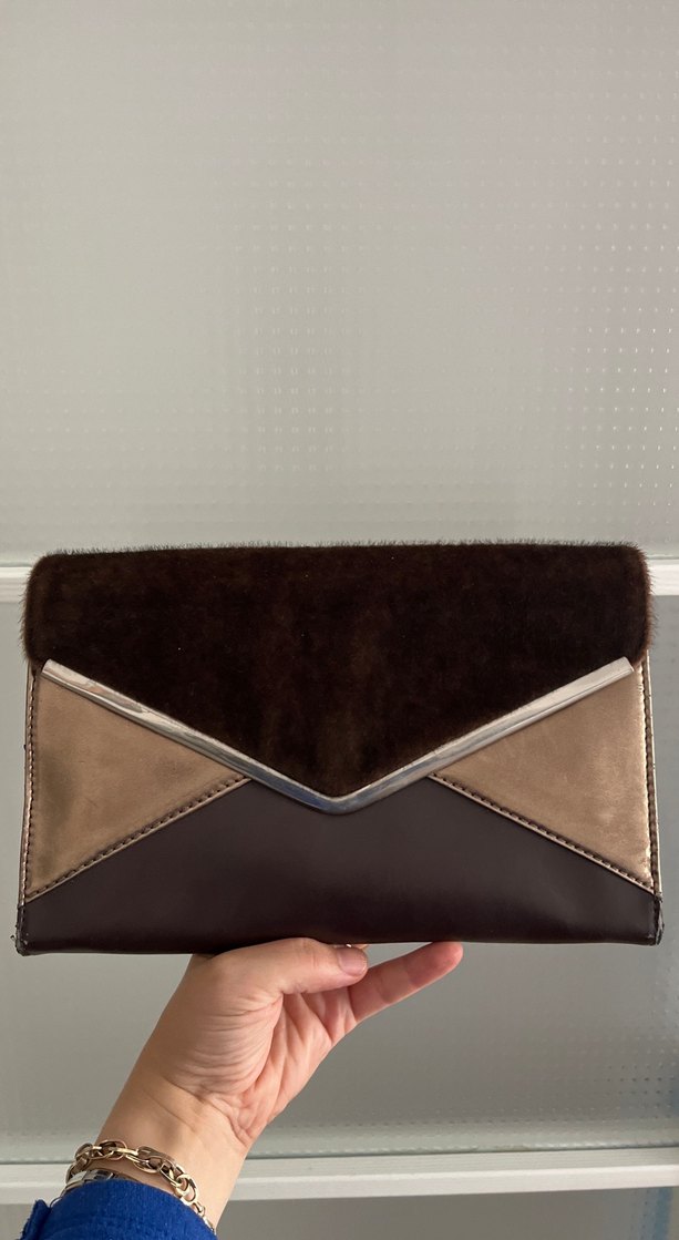 Kahverengi deri ve kürk detaylı, metalik vurgulu modern klasik tasarıma sahip kadın portföy çanta. Ofis kullanımına uygun.