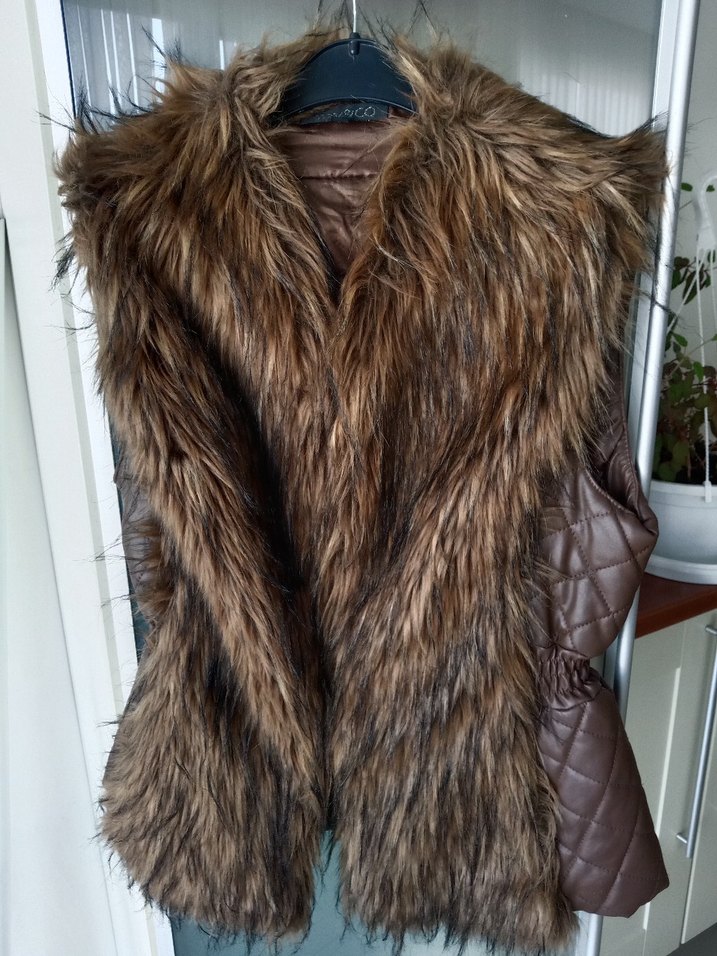 Kahverengi deri, kürklü detaylı, askısız ve vücuda oturan kadın yeleği, günlük kullanıma uygun bohem tarzda rahat bir model. L yazıyor ama 35 38 bedene daya uygun