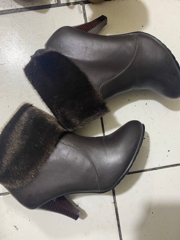 Kahverengi deri stiletto topuklu botlar, bilek kısmında kürk detayına sahiptir. Gotik tarzıyla günlük kullanıma uygundur. Arka kısmında soyulmalar Mevcut sadece