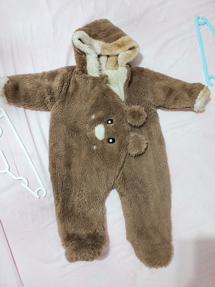 Kahverengi, yumuşak ve sıcak kumaştan yapılmış, kürklü ve nakışlı ayı yüzlü kapüşonlu erkek bebek kozmonot tulumu. Soğuk havalarda gönül rahatlığıyla kullandım alanda o rahatlıkla kullanır umarım detay için mesaj atabilirsiniz.
