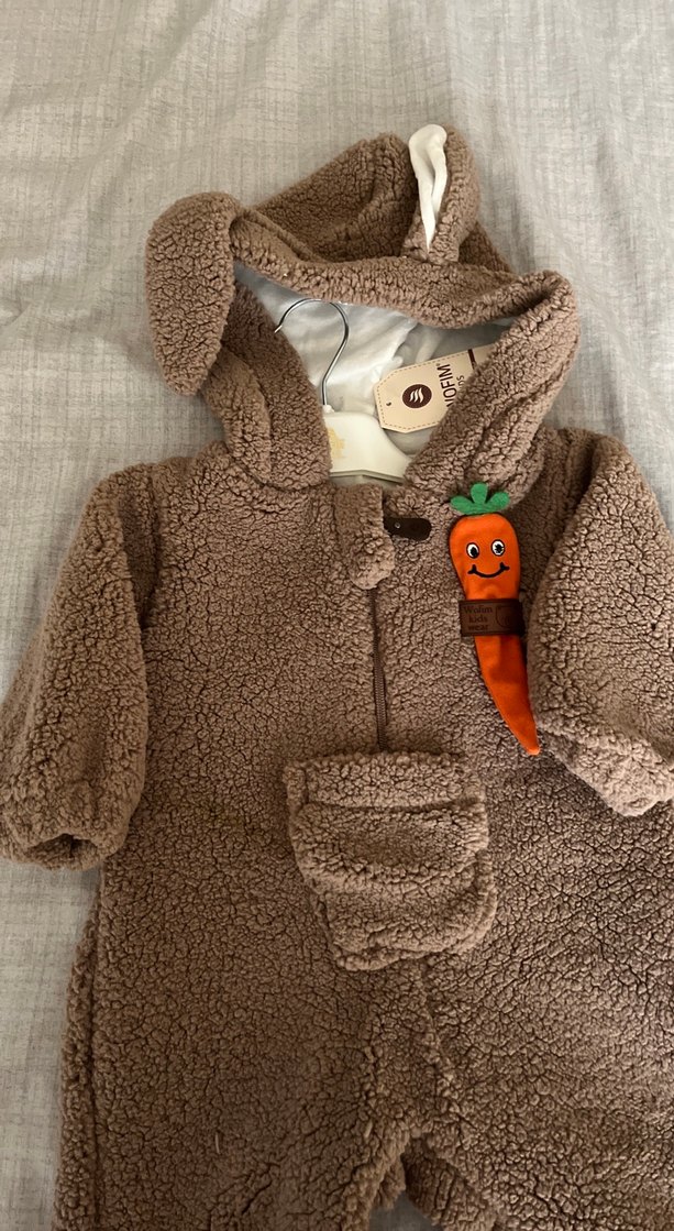 Kahverengi, yumuşak ve sıcak kumaştan yapılmış erkek bebek tulumu. Kürk detaylı, kulaklı kapüşon ve baskılı havuç oyuncağı bulunur. ❄️ 6/9 ay