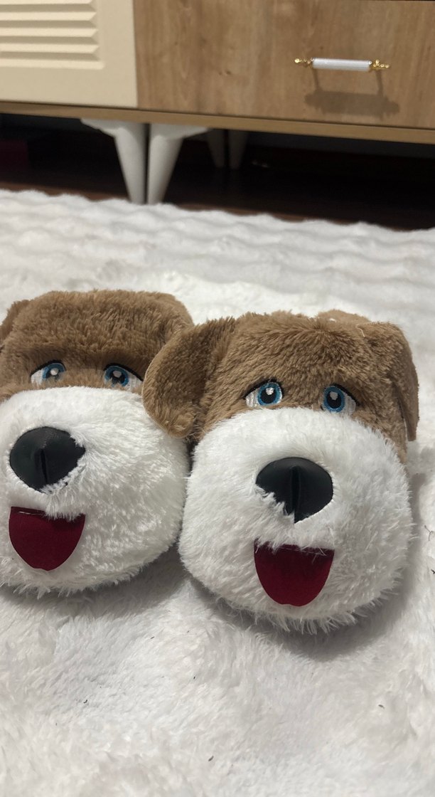 Kahverengi ve beyaz renklerde, yumuşak kumaş ve kürk detaylı, köpek yüzü şeklinde erkek çocuk ev terliği.