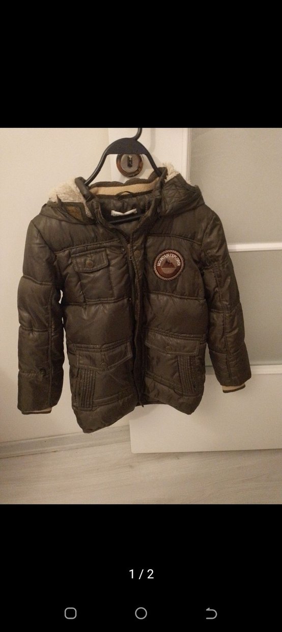 Kahverengi, kürklü ve işlemeli detaylara sahip, yumuşak dokulu fleece kumaştan erkek çocuk montu. Notch yaka ve dar kesimlidir.