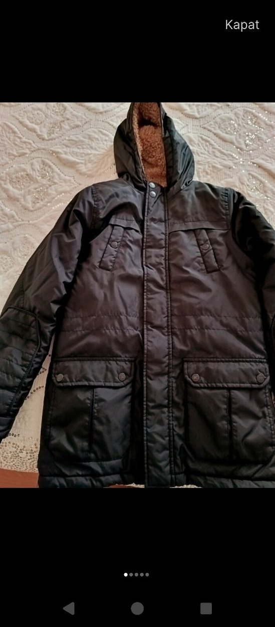 Kahverengi, kürk detaylı erkek kaban, uzun kollu ve notched yaka ile rahat bir kesime sahiptir. Orta boy, cep detaylı ve sıcak tutan yumuşak kumaş kullanılmıştır.
