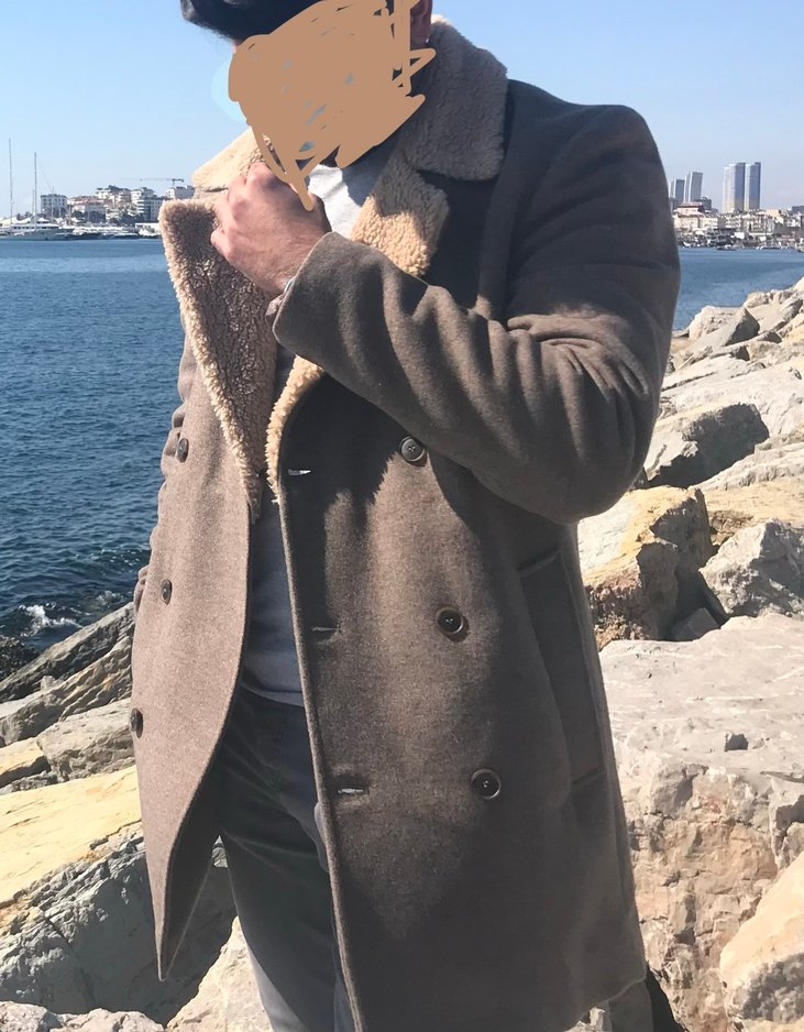 İki kere giyildi. Kahverengi yün kaban, kürk detaylı ve kesik yakalıdır. Normal kesim, uzun kollu ve midi boydadır, günlük sokak stili için uygundur.
