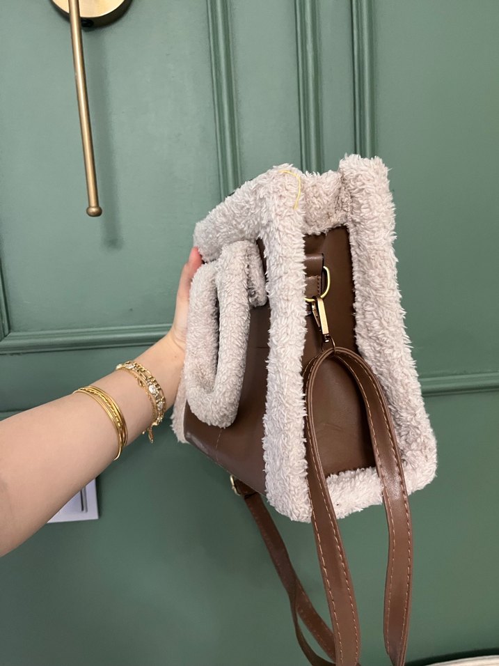 Kahverengi, yumuşak ve sıcak kumaş detaylı kadın çantası. Kürk süslemeli ve günlük sokak stiline uygun.