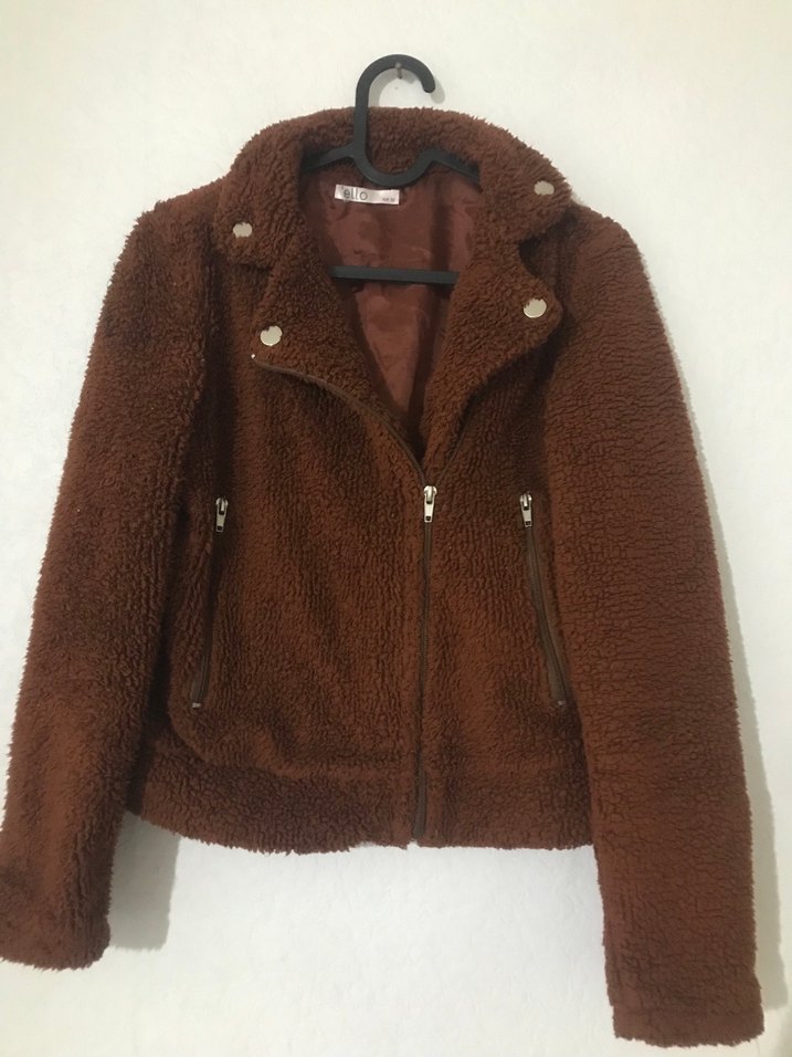 Kahverengi, uzun kollu, kürklü detaylı biker ceket. Normal boyda, dar kesim ve yakası notalıdır. Rahat ve sıcak tutar.