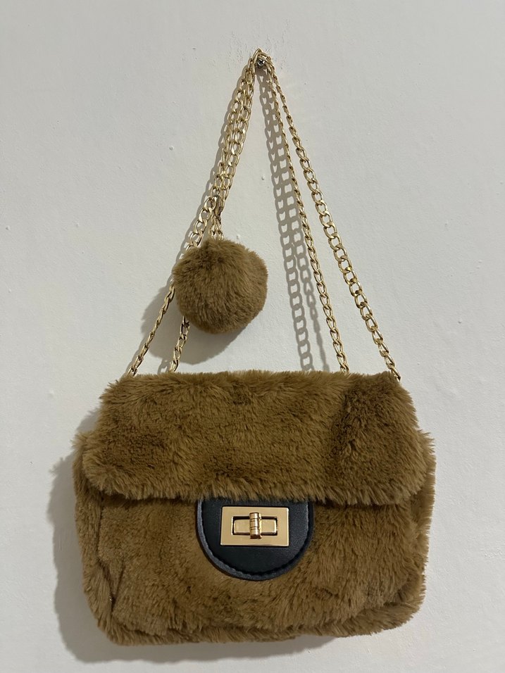 Kahverengi peluş kadın çanta, yumuşak kürk detaylı, altın rengi zincir askı , içi deri