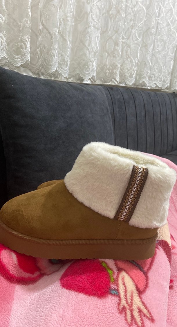 Yumuşak kürklü manşet ve işlemeli detaylı, kahverengi dolgu topuklu kadın botu. Sıcak tutan yumuşak kumaştan üretilmiştir, günlük kullanıma uygundur.
