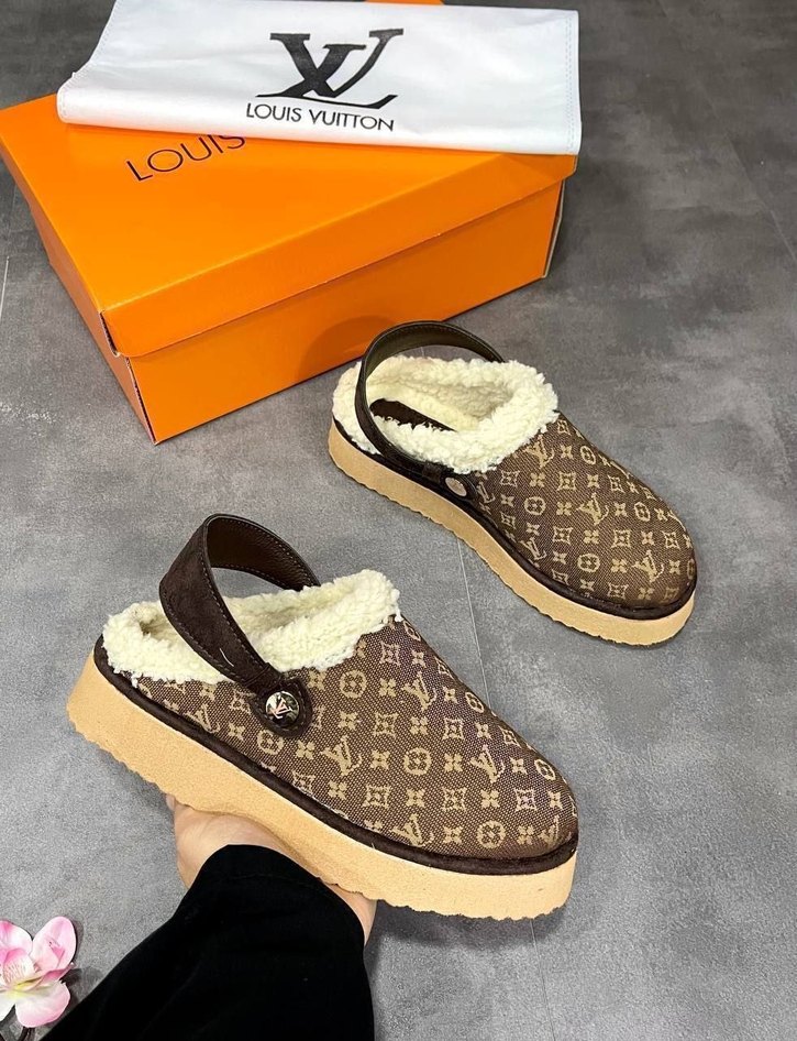 Kahverengi baskılı, kürklü detaylı kadın terlikleri, dolgu topuklu ve kauçuk tabanlıdır. Rahat ve bohem tarzda günlük kullanım için uygundur.