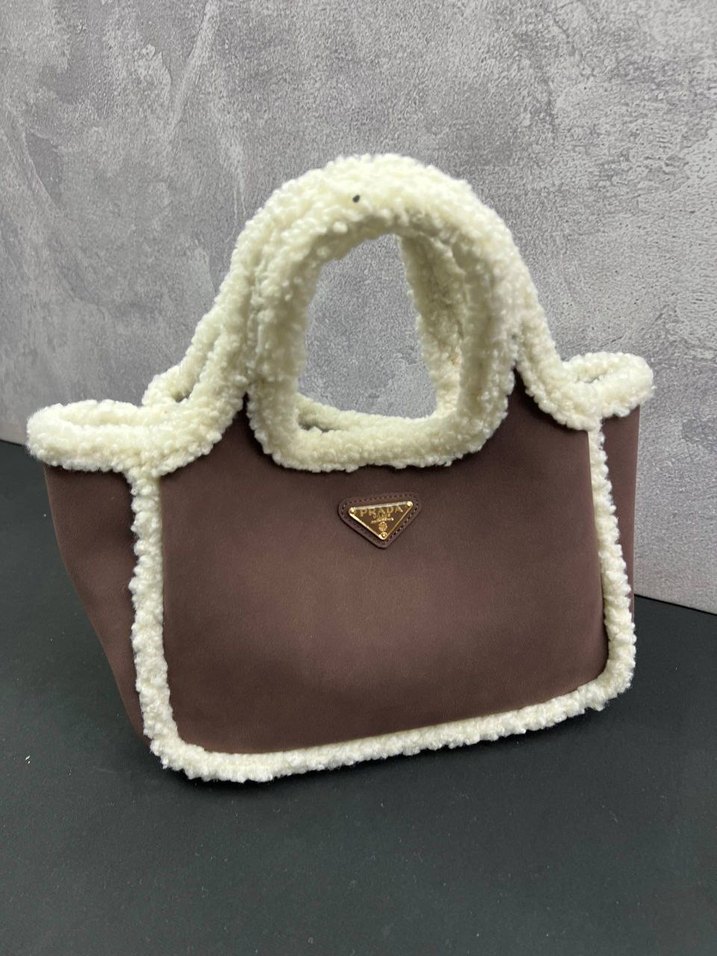 Kahverengi, yumuşak kürklü detaylara sahip kadın el çantası. Rahat sokak stili için pastel tonlu ve desenli bir model. ✨PRADA✨ KIŞLIK KÜRKLÜ SÜET Luxury kalite