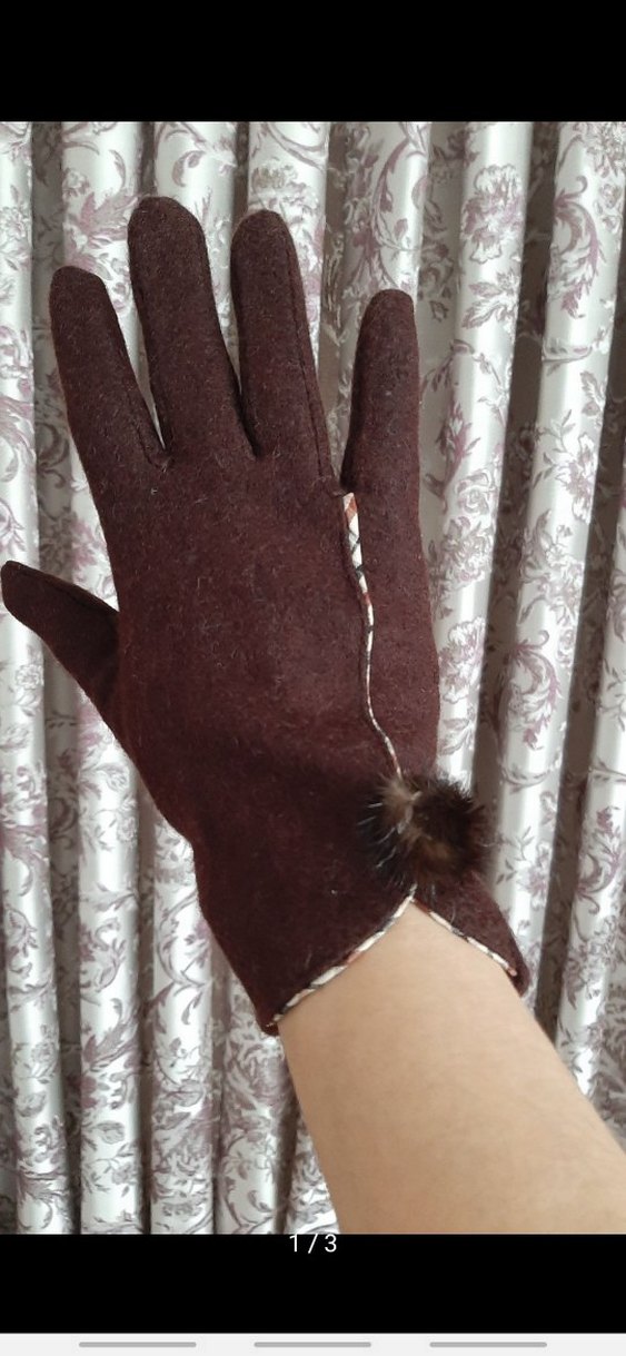 Koyu kahverengi, yumuşak ve sıcak kumaştan yapılmış, kürk detaylı kadın eldiveni. keçe.