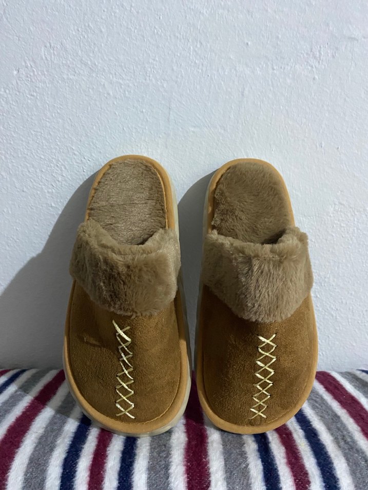 Kahverengi kadın ev terlikleri, yumuşak kürk detayları ve nakışlı süslemelerle rahat ve bohem tarzı sunar.