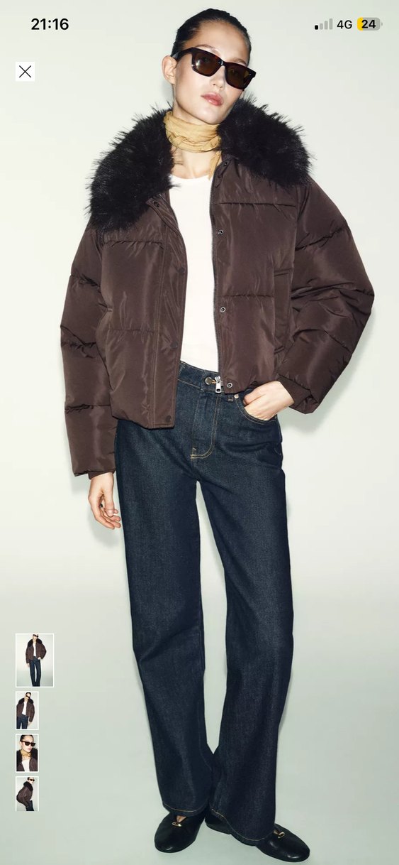 Kahverengi, kürklü yakalı, bol kesim günlük ceket. Bisiklet yaka, uzun kollu ve midi boydadır. Denim görünümlü kumaştan üretilmiştir.