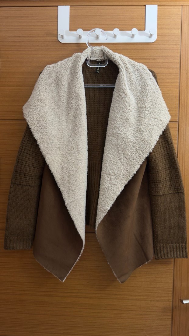 Kahverengi kadın hırka, suni kürklü yakası ve rahat kesimiyle dikkat çeker. Uzun kollu ve midi boyda, sıcak ve yumuşak kumaştan üretilmiştir.